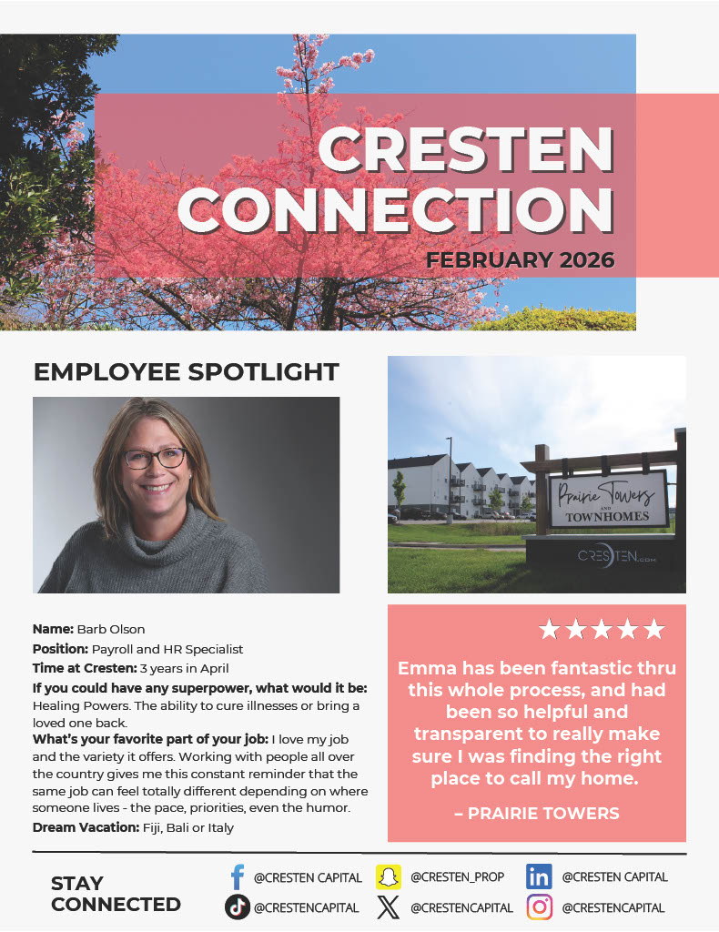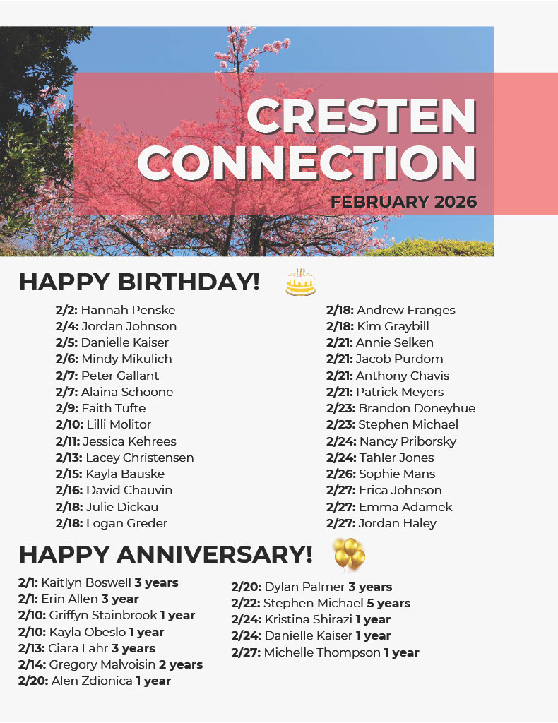 Cresten Connection Your monthly insider update — fresh each month. February 2026 Cresten Connection Past Editions January 2026 Cresten Connection December 2025 Cresten Connection November 2025 Cresten Connection October 2025 Cresten Connection September 2025 Cresten Connection August 2025 Cresten Connection July 2025 Cresten Connection June 2025 Cresten Connection May 2025 Cresten Connection April 2025 Cresten Connection March 2025 Cresten Connection